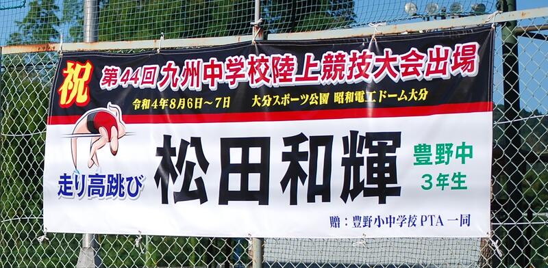 本校中学3年生 松田和輝さんが「第44回九州中学校陸上競技大会」に出場するにあたり、PTA予算においてお祝いと応援の横断幕を作成していただきました。本当にありがとうございました!走り高跳びは8月6日(土)に行われ、ハイレベルな闘いが繰り広げられた模様です。まだまだ伸び盛りの松田さんのこれからの活躍が楽しみです!