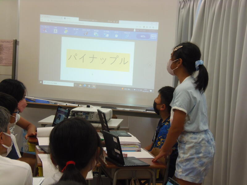小学4年生の外国語の授業です。ネイティブの子どもたちのスピーチの内容を聞き取っていました。もう一回聞きたいときは「Once more!」と伝えることができていました。