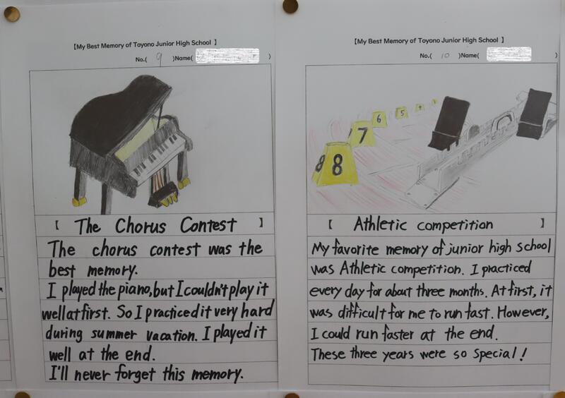 階段に、中学3年生の英作文が掲示されていました。中学校での思い出、数えきれないくらいあることでしょう。充実した3年間を過ごし、豊野小・中学校を力強くリードしてくれました。