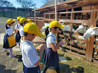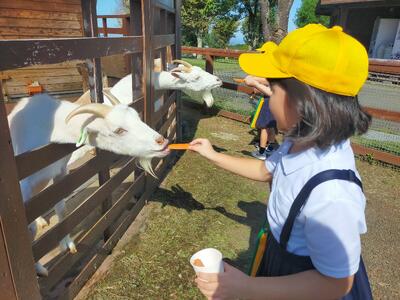 少し怖がりながらも山羊や羊に餌やりをしました。