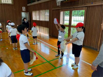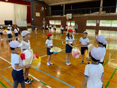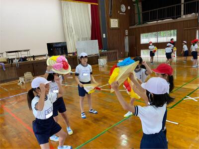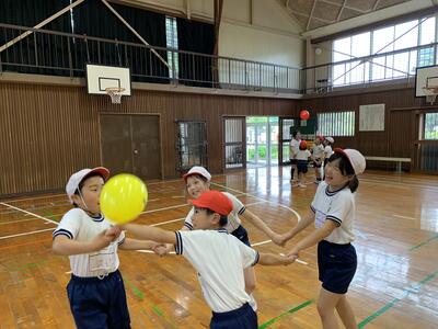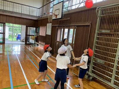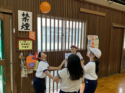 4年生の体育では、体ほぐし運動の一つとして風船バレーを実施しました。