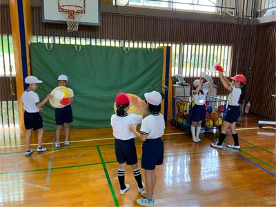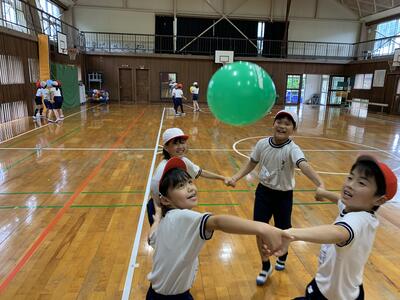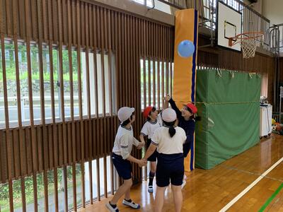 体育の授業では、一緒に風船バレーをしました。