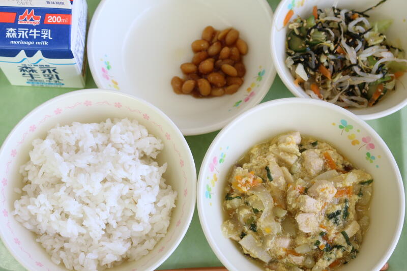 『麦ごはん・親子煮・野菜の磯和え・ざぜん豆・牛乳』です。