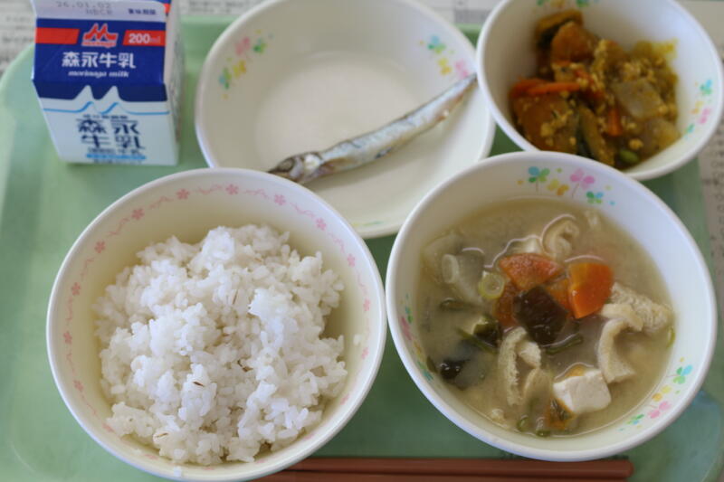 『麦ごはん・大根のみそ汁・ししゃものガーリック焼き・かぼちゃのそぼろ煮・牛乳』です。