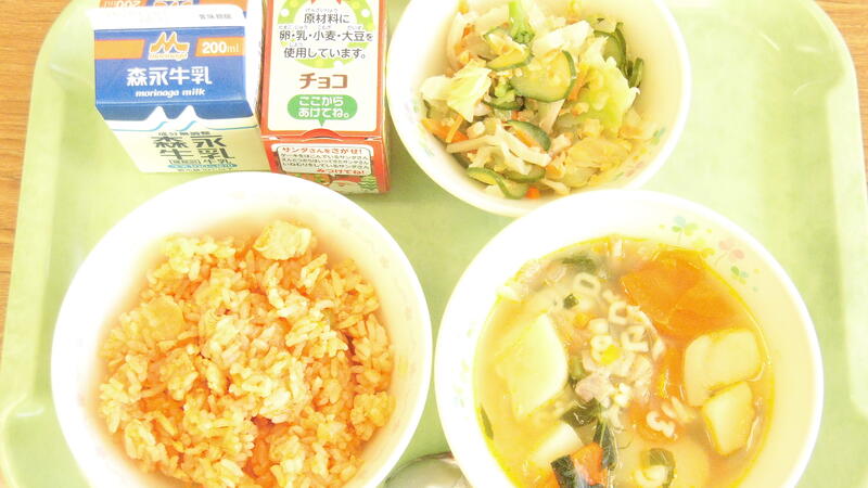 『コッペパン・大豆と鶏肉のトマト煮・花野菜サラダ・ムース・牛乳』です。