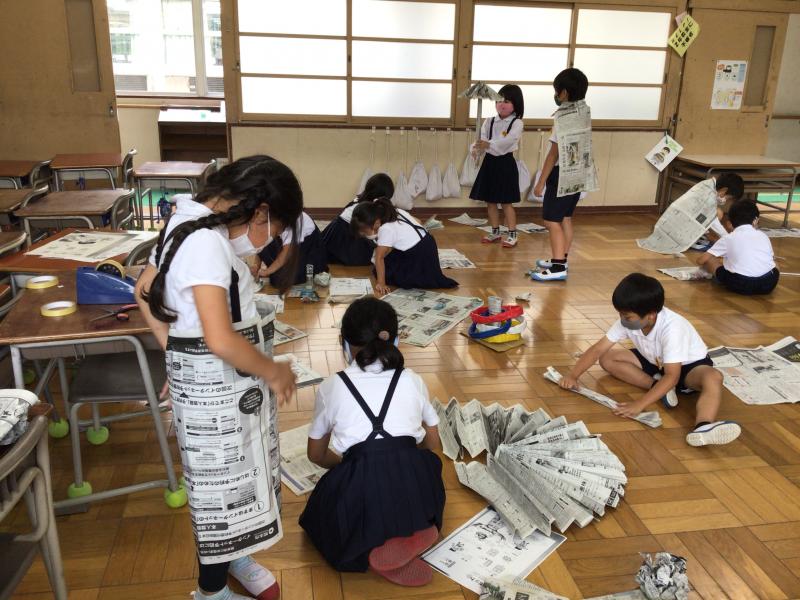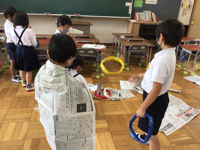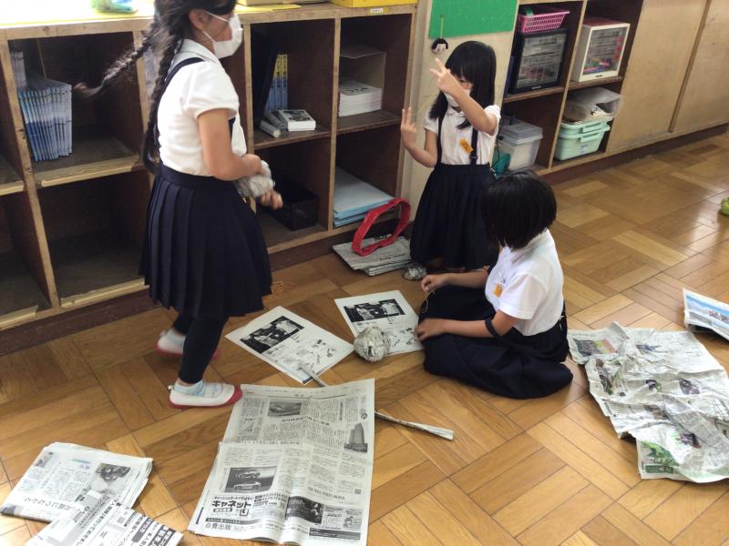今日の図工は、新聞紙を使ってたくさん遊びました。