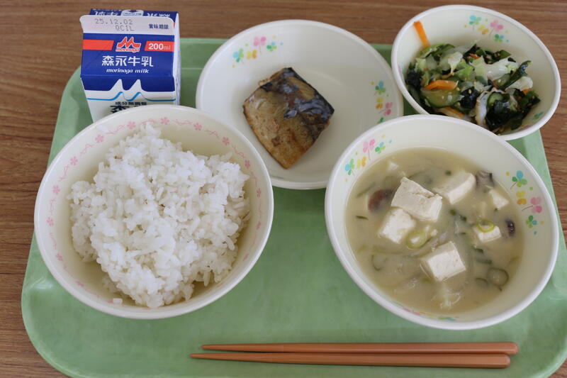 『麦ごはん・呉汁・さばのソース煮・ちくわとわかめの酢の物・牛乳』です。