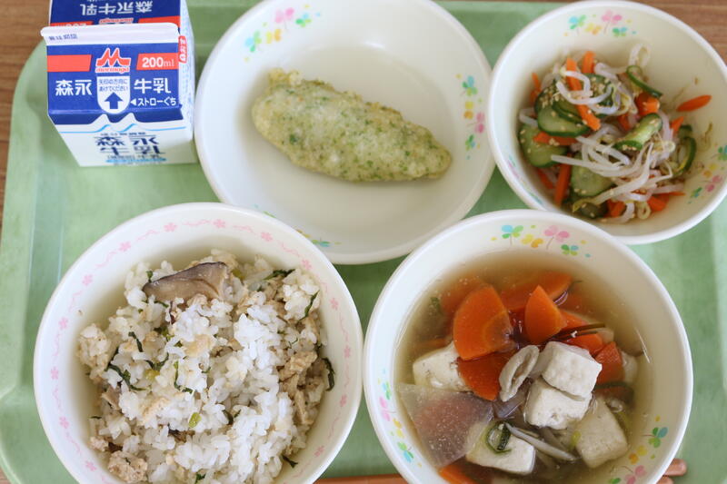 『こぎつねごはん・いちょう葉汁・たらのいそべ揚げ・ごまず和え・牛乳』です。