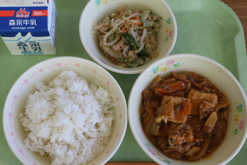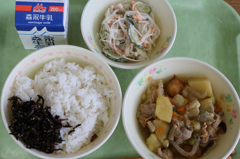 『麦ごはん・肉じゃが・春雨のマヨネーズ和え・ひじきときくらげのふりかけ・牛乳』です。
