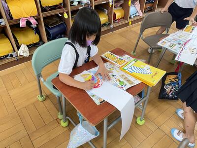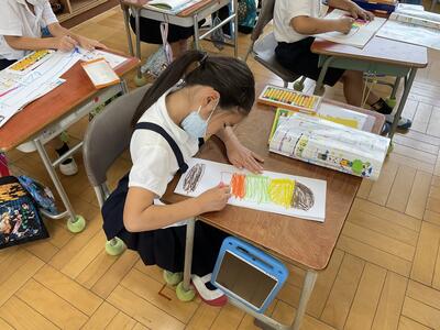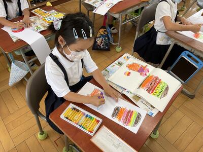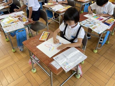 今週の図工の授業では、長い紙に絵を描く活動をしました.