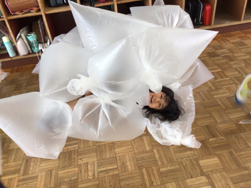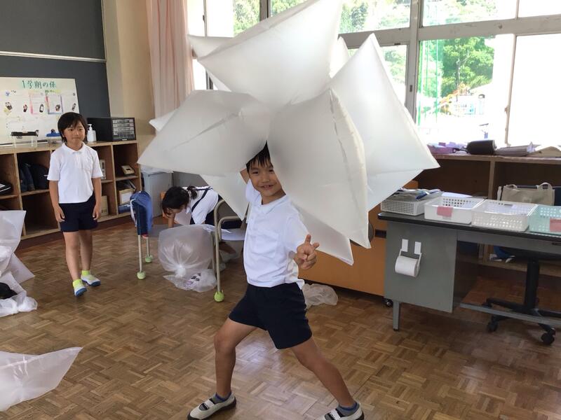 5月14日(水)にビニール袋を使って空気のここちよさを感じる授業を行いました。子どもたちどうしで協力して、秘密基地や自分だけの家、ふわふわの武器などを作っていました。空気の量を調節したり、ビニール袋のつなげ方を工夫したりして取り組むことができました。