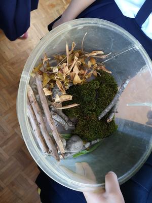 理科室に行き、ヤモリを飼う道具を調達したり、外で苔や枝、虫などを拾ってきたりしてヤモリハウスを一気に創り上げました。