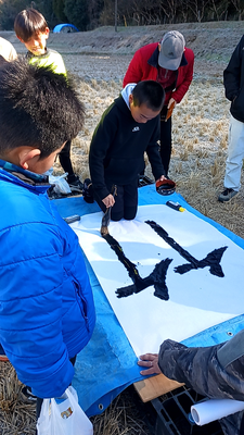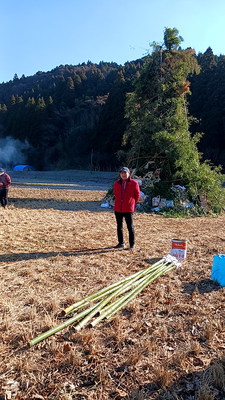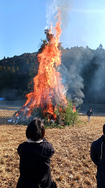 前日は、PTAや地域の皆さんで竹を切り、櫓を組み、廃材や笹、切り出した草木を積み上げ、見事などんどやができあがりました。