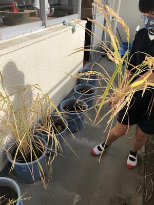 6月に種まきから始めたバケツ稲の稲刈りをしました。