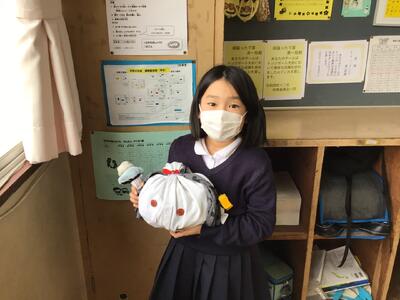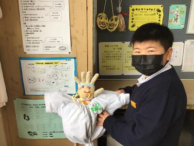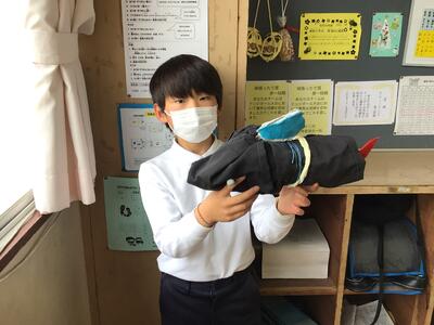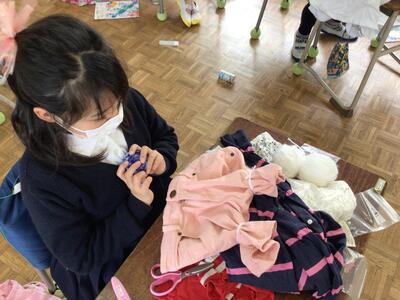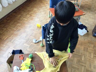 図工の授業で着なくなった服や履けなくなった靴下などを使って、工作をしました。
