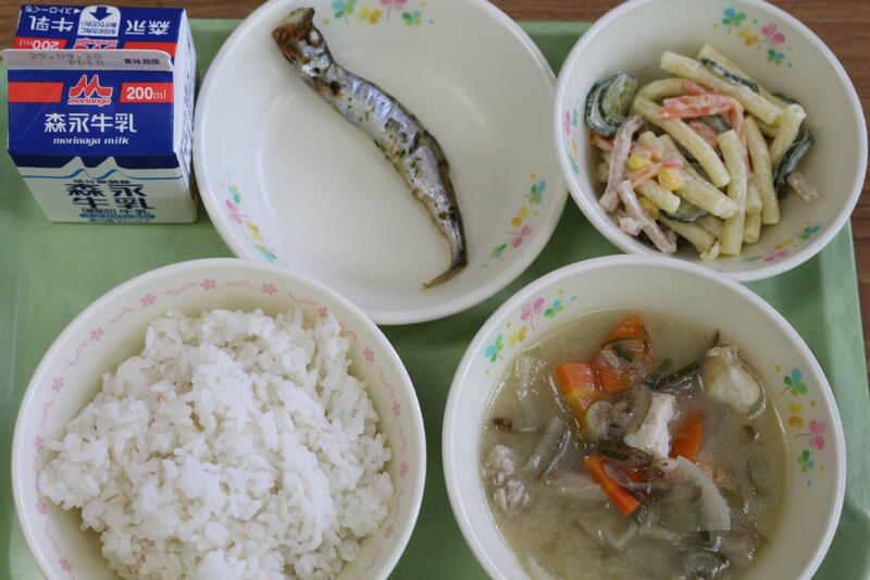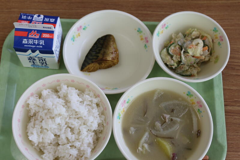『麦ごはん・さつま汁・さばのカレーしょうゆ漬け・野菜の梅マヨあえ・牛乳』です。