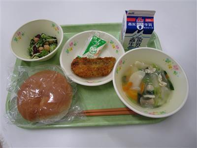 『カットまるパン・ラビオリスープ・ホキフライ・豆とベビーリ-フのサラダ・牛乳』です。