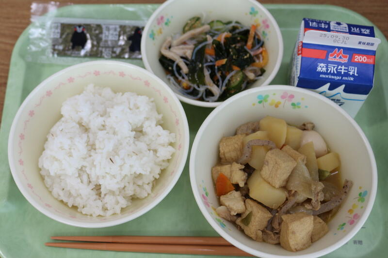 『麦ごはん・五目肉じゃが・春雨の酢の物・一食のり・牛乳』です。