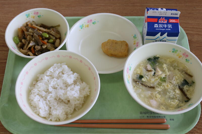 「麦ご飯・牛乳・ふしそうめん汁・南関あげの卵とじ・なし」です。