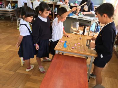 2年生のつくったおもちゃで、1年生と一緒に遊びました。