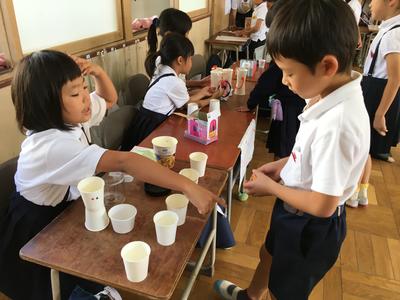 算数科「かたちあそび」で、箱や筒を使って、車やお城、自動販売機、滑り台など、ユニークなものを思いついてつくることができました。時間を忘れて、夢中で作る子どもたち。この遊びの中で、箱や筒の形や特徴をしっかりと捉えることができました。