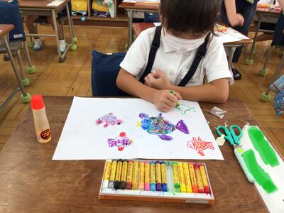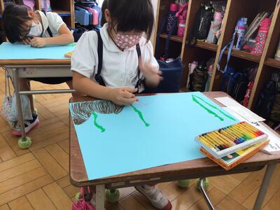 1年生は、図工の時間で、お話の中に出てくる場面を絵に描きました。
