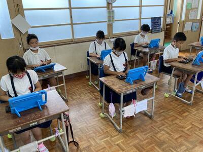 5年生、家庭科では単元計画を入れ替え、ミシン縫いの学習をしています。