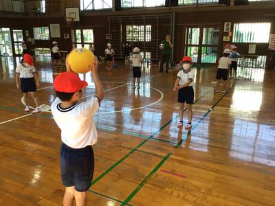 「自分で投げて、自分でキャッチする。」「ペアの友だちに投げる。」など様々な動きを取り入れています。