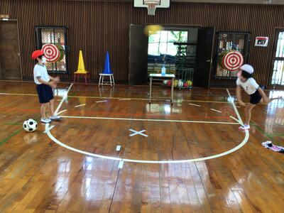 そして、的当てを中心に、自分が狙った所に投げることを目的に場づくりを行い、実践しています。