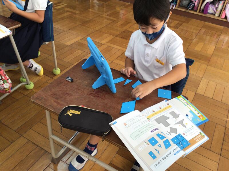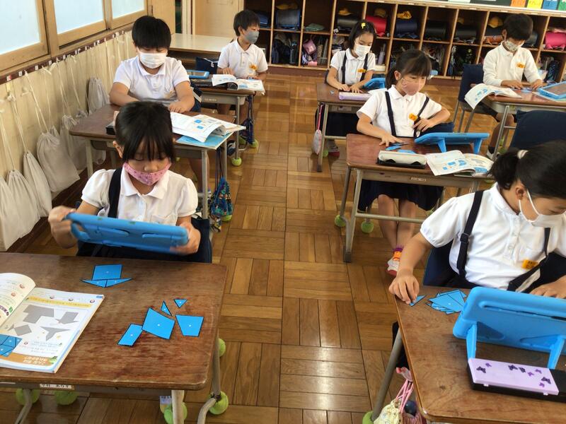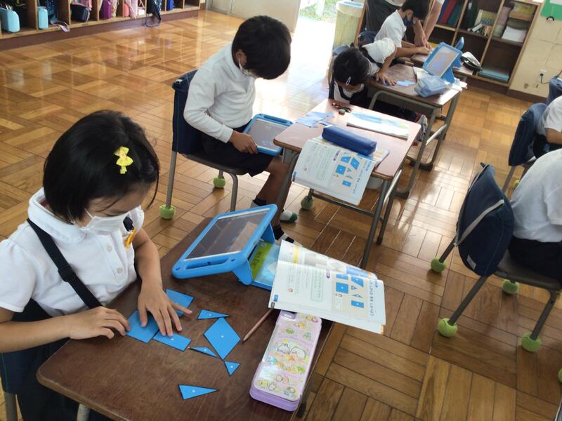 1時間目の今日は、様々な大きさや形のパズルを組み合わせて、ロケットや魚、家などを作りました。