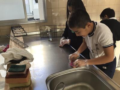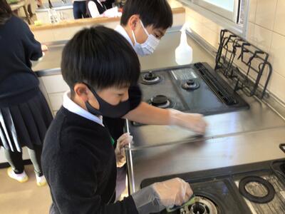 家庭科で習ったことを生かし、家庭科室のキッチンをきれいにしました。