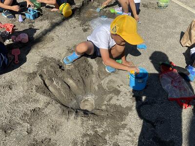 子どもたちは、ずっと夢中になって作っていました。水分補給もしっかりしながら、朝の比較的気持ちいい天候のもと、砂遊びができて良かったです。