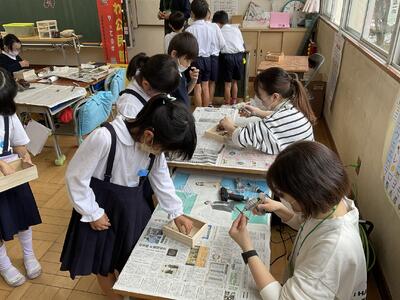 どんぐり先生やボランティアの学生さん、先生方などのサポートを受けてどんぐり工作を仕上げていきました。