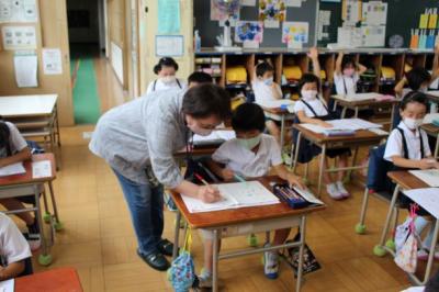 6月30日 1年生の書写の時間に、2名のボランティアに入っていただきました。