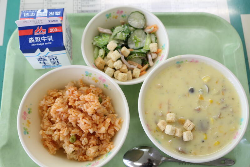 『チキンライス・コーンスープ・シーザーサラダ・牛乳』です。