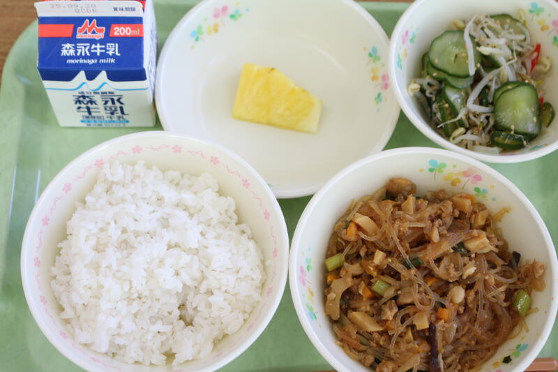 『麦ごはん・マーボー春雨・もやしとピーマンのじゃこあえ・パイン・牛乳』です。