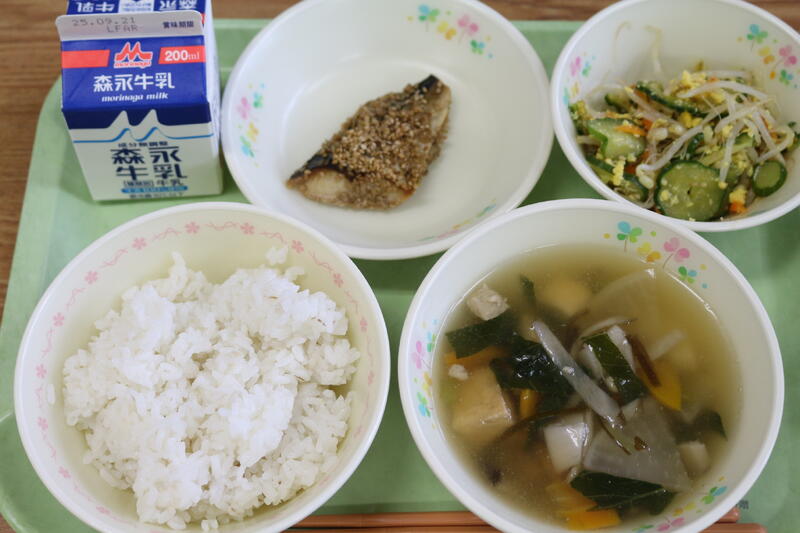 『麦ごはん・けんちん汁・さばのゴマ焼き・ゴーヤと卵のサラダ・牛乳』です。