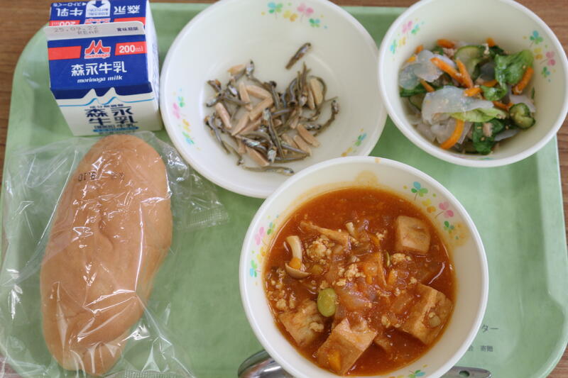 『コッペパン・厚揚げのミートソース・こんにゃくのサラダ・いりことアーモンド・牛乳』です。