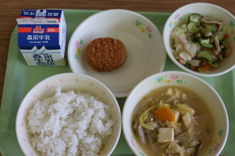 『麦ごはん・キムチ豚汁・牛肉コロッケ・炒り大豆のサラダ・牛乳』です。
