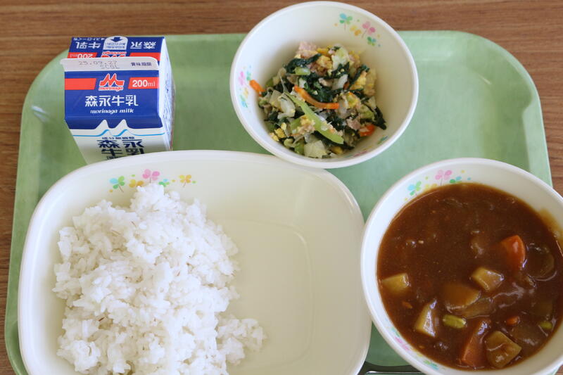 『麦ごはん・チキンカレー・小松菜と卵のサラダ・牛乳』です。