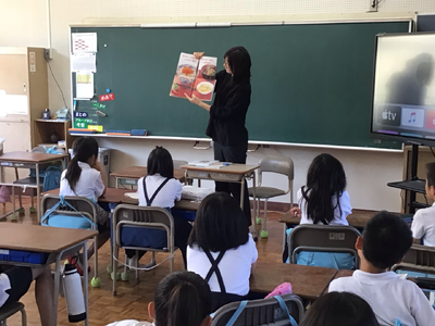 今回は、双方初回ということで、簡単な英語での自己紹介を行いました。その後は、津森小のALTの先生から熊本の食べ物を紹介する授業、大甲小の先生から、大甲小の周りにあるお店などについての英語の授業を行いました。