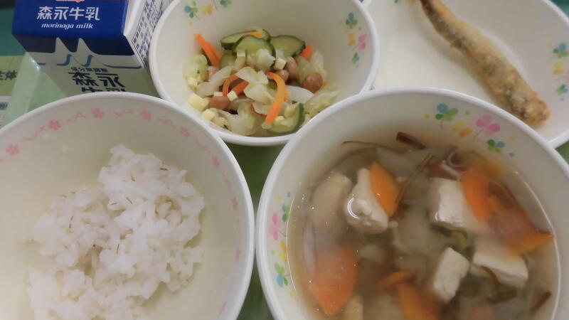「麦ご飯・牛乳・とりだんご汁・ししゃもフライ・かみかみチーズサラダ」です。
