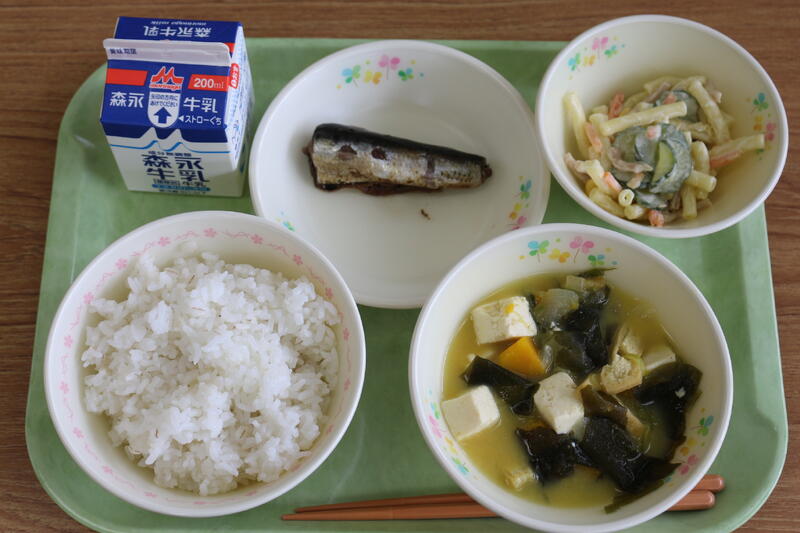 『麦ごはん・かぼちゃのみそ汁・いわしの梅煮・マカロニサラダ・牛乳』です。