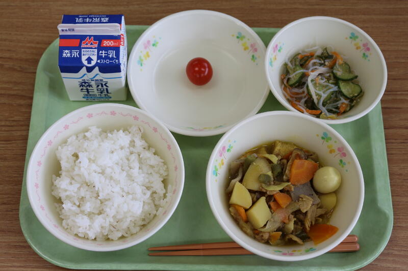 『麦ごはん・カレー肉じゃが・春雨のごま酢和え・ミニトマト・牛乳』です。