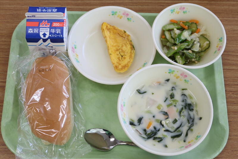 『コッペパン・小松菜のクリームスープ・オムレツ・アスパラサラダ・牛乳』です。