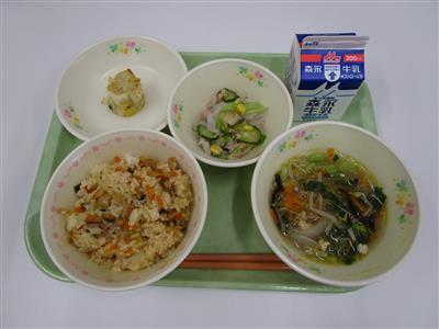 『キムチごはん・チンゲンサイの中華スープ・とうふシューマイ・こんにゃくサラダ・牛乳』です。