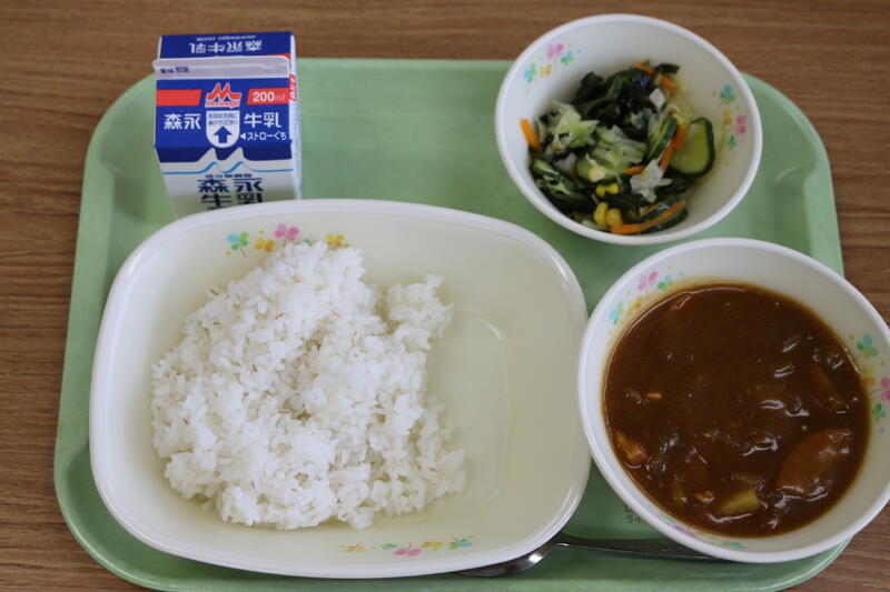 『麦ごはん・チキンカレー・わかめとコーンのサラダ・牛乳』です。
