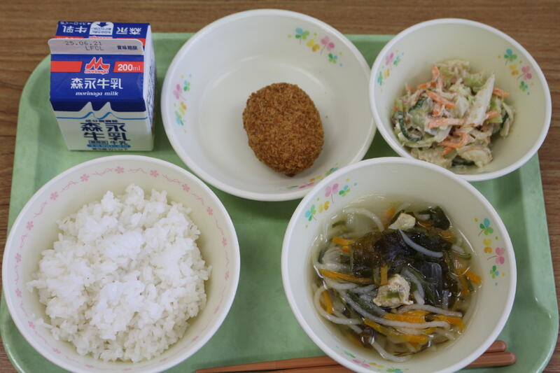 『麦ごはん・うおそうめん汁・コロッケ・野菜のうめマヨ和え・牛乳』です。
