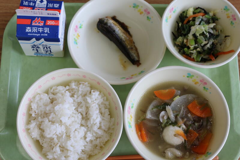 『麦ごはん・だまこ汁・いわしの甘露煮・ひじきと小松菜のサラダ・牛乳』です。