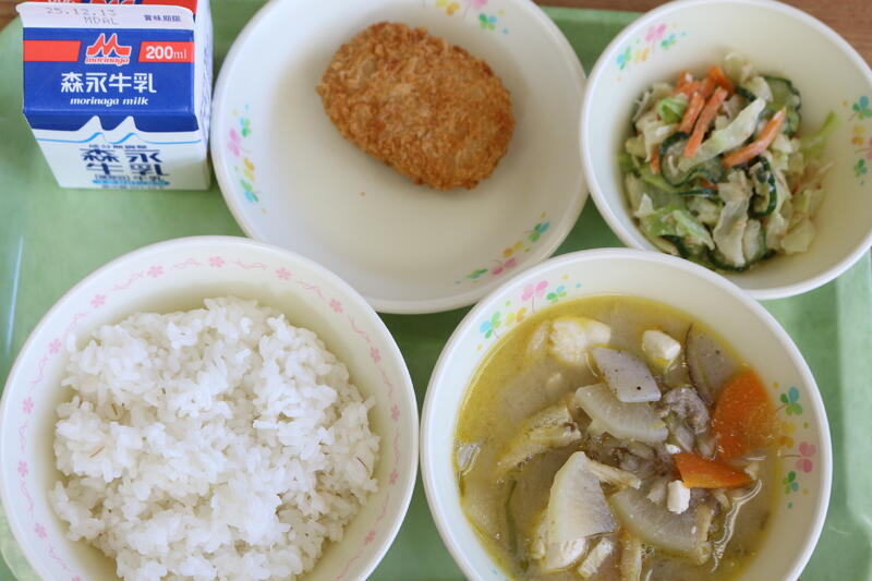 『麦ごはん・豚汁・コロッケ・ささみと野菜のごま和え・牛乳』です。